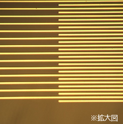 くし歯電極(くし形電極)基板は、ガラスなど絶縁基板上に「櫛の歯」のような形状で高密度に配列された電極を形成した微細パターンチップです。(電極間隔:Line/Space=10/10μmまたは5/5μm)