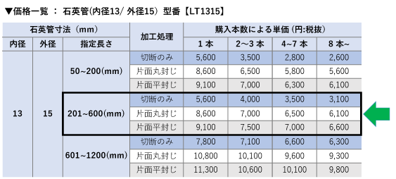 ・石英管のサイズ(径)違いの製品は対象となりません。