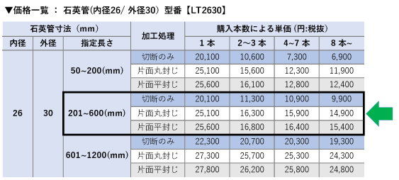 ・石英管のサイズ(径)違いの製品は対象となりません。